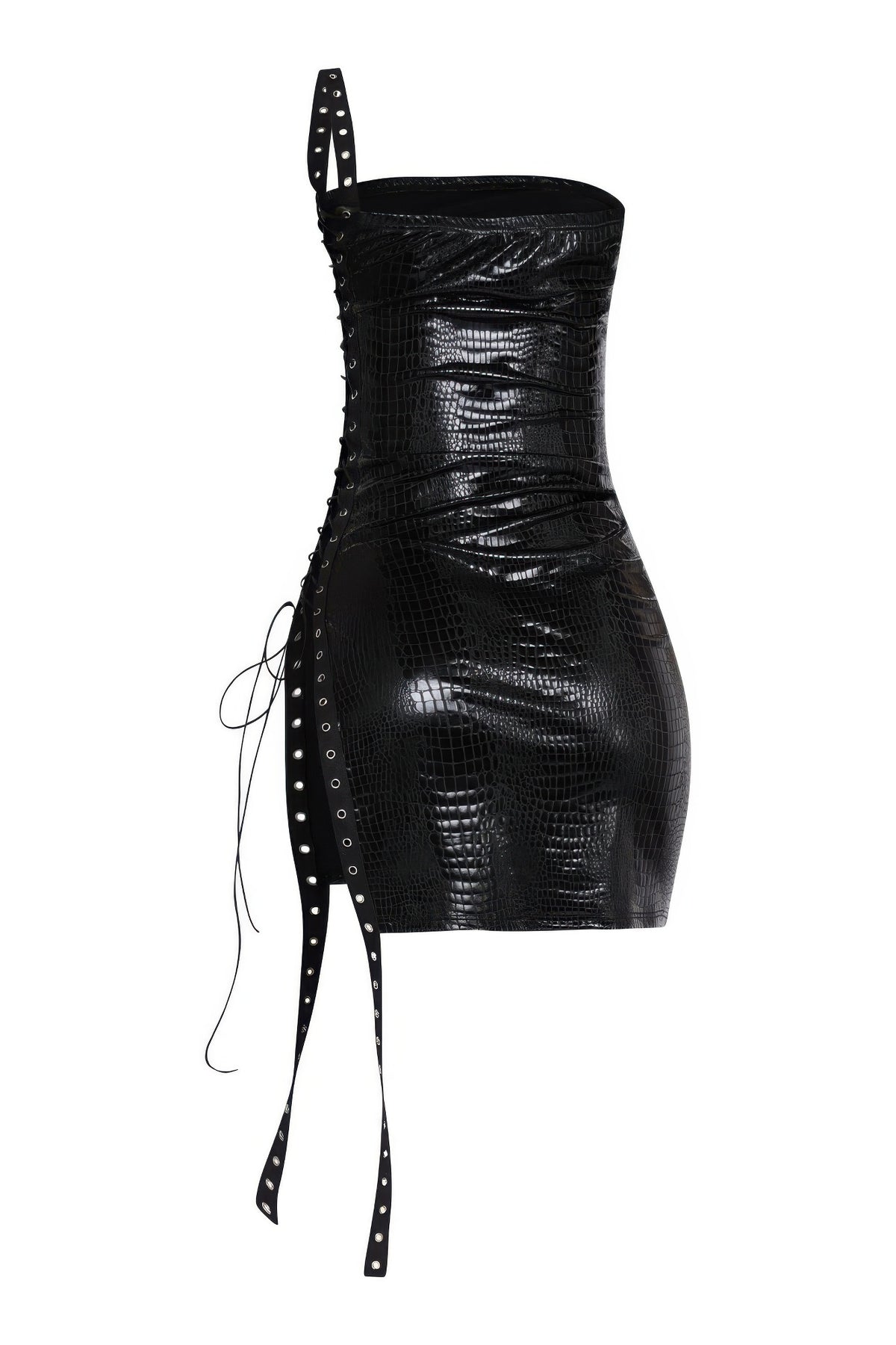 Turn heads in this side open lace-up tube dress, designed for sleek, statement-making style. With a strapless tube top silhouette and slim, body-skimming fit, this mini dress highlights your curves while offering comfortable stretch. The lace-up detailing along the side adds a bold, adjustable accent that shows just the right amount of skin. Crafted from a soft and stretchy fabric blend, it pulls on easily and stays in place for confident wear. Perfect for nights out or bold event dressing, this piece blends modern edge with sultry appeal.